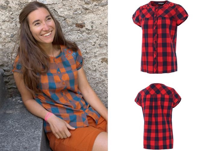 Charming little checker blouse with round neck and full-lenght button border made of pure cotton.Â